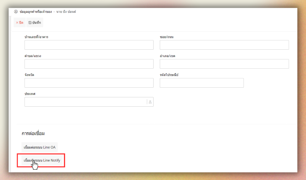 ผู้ใช้งานสามารถทำได้โดยไปที่การแก้ไขข้อมูลเจ้าของ จากนั้นเลื่อนลงล่างสุดจะเจอปุ่มเชื่อมต่อระบบ Line Notify