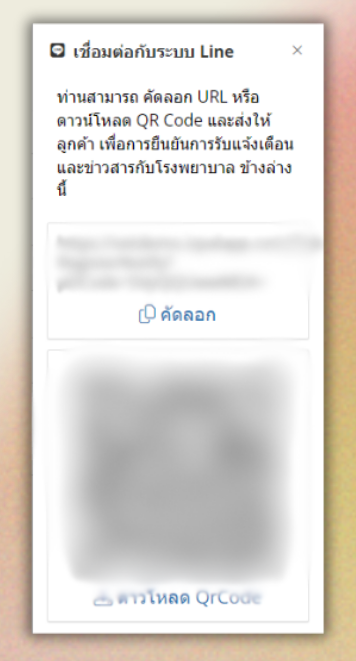 ผู้ใช้งานสามารถ คัดลอก URL หรือ ดาวน์โหลด QR Code และส่งให้ลูกค้า เพื่อการยืนยันการรับแจ้งเตือนและข่าวสารกับโรงพยาบาล ข้างล่างนี้