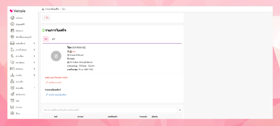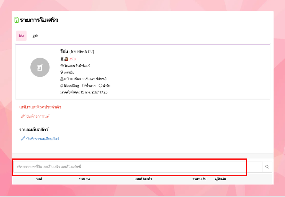 ไปที่เมนูสัตว์เลี้ยงและลูกค้า > ค้นหาชื่อสัตว์เลี้ยงหรือเจ้าของที่ต้องการยกเลิกใบเสร็จ > คลิก จุดสามจุด > คลิก รายการใบเสร็จ