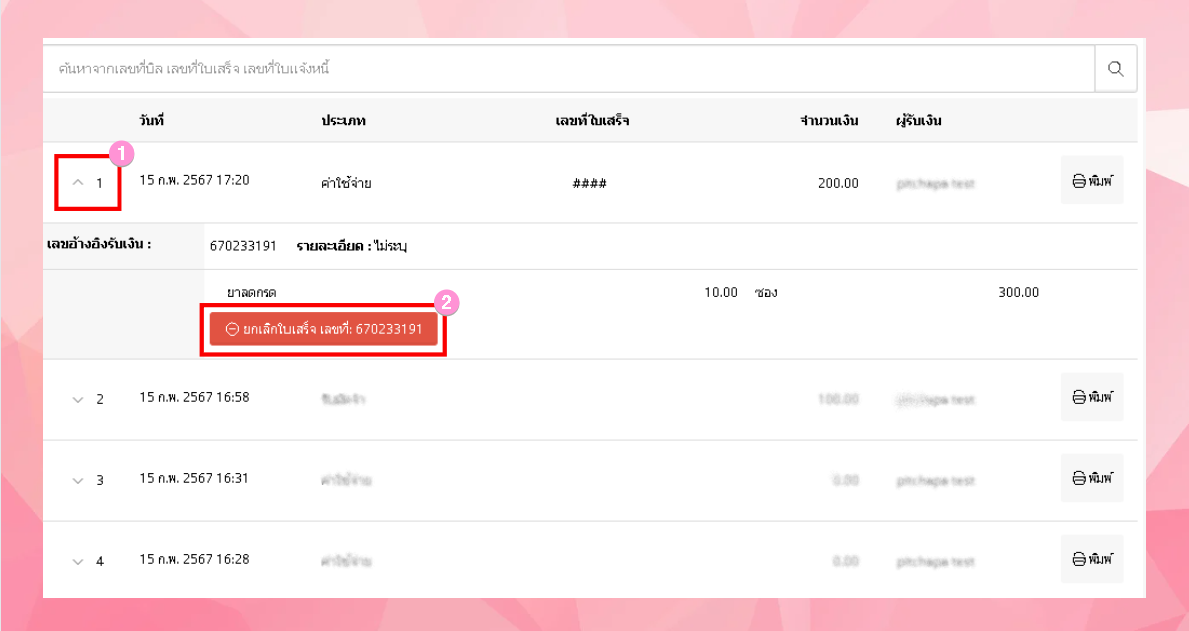 หมายเหตุ : สามารถยกเลิกใบเสร็จได้ภายใน 24 ชั่วโมง หากยกเลิกใบเสร็จแล้ว จะไม่สามารถกู้คืนได้อีก และไม่สามารถแก้ไขประวัติการรักษาได้