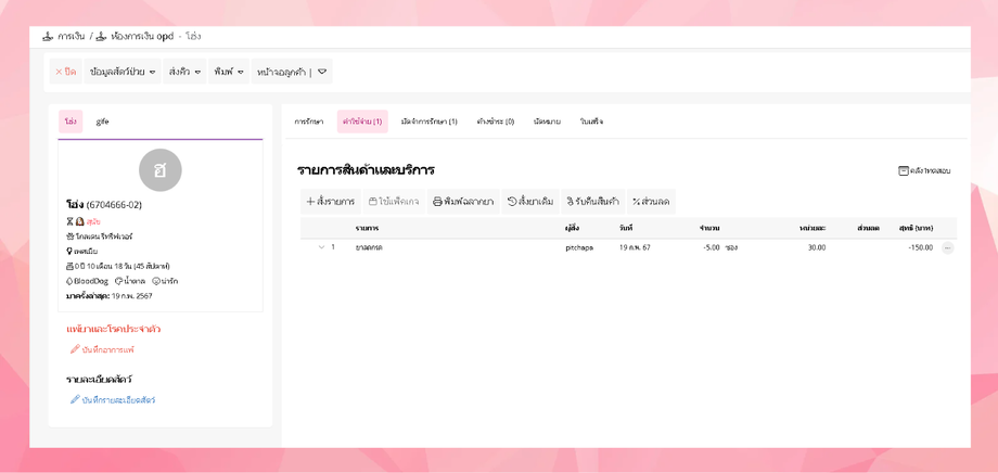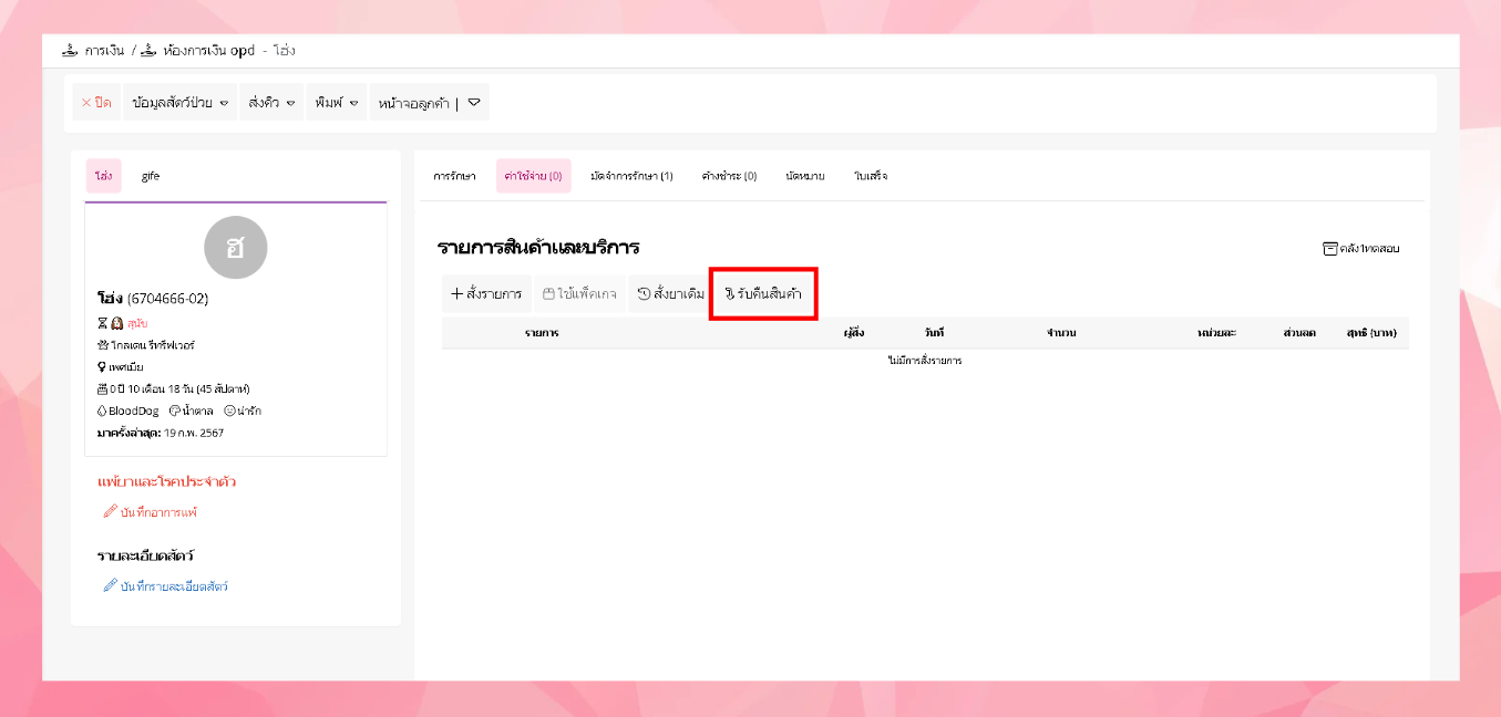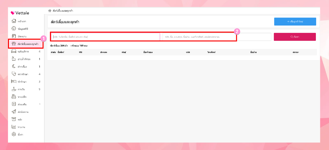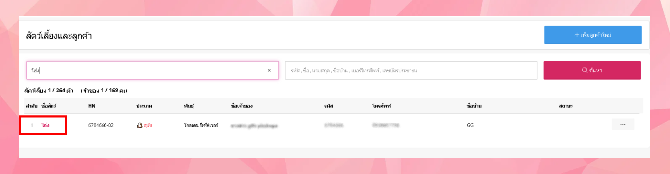 ไปที่เมนูสัตว์เลี้ยงและลูกค้า > ค้นหาชื่อสัตว์เลี้ยงหรือเจ้าของที่ต้องการรับคืนสินค้า > คลิกชื่อสัตว์เลี้ยง