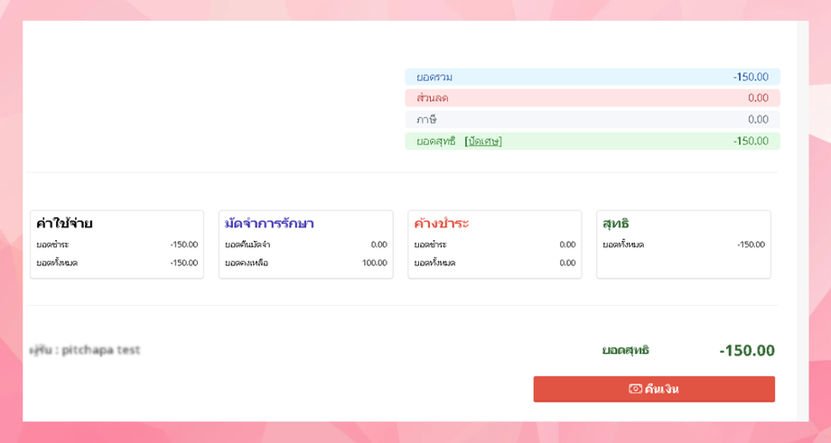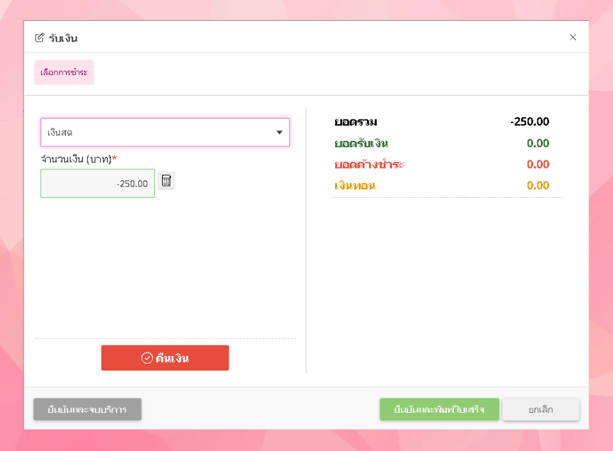 ผู้ใช้งานทำการระบุช่องทางการชำระเงิน เช่น เงินสด, บัตรเครดิต, หรือโอนเงิน > คลิกคืนเงิน > คลิกยืนยันและจบบริการ หรือ ยืนยันและพิมพ์ใบเสร็จ