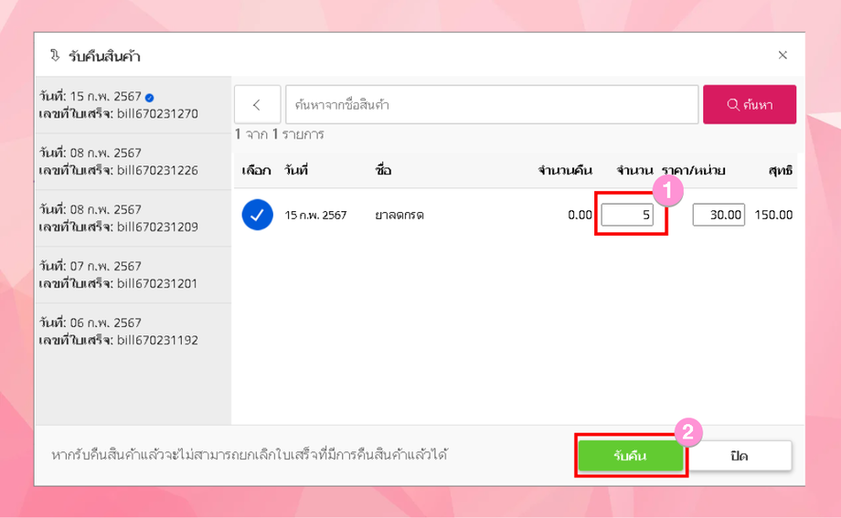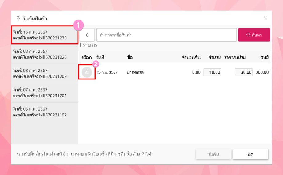 เลือกใบเสร็จที่ต้องการทำการคืนสินค้า