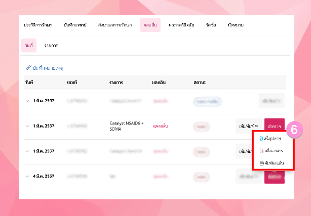 คลิกเพิ่มที่รายการผลแล็บ > ผู้ใช้งานสามารถ เพิ่มรูปภาพ เพิ่มเอกสาร และพิมพ์ผลแล็บ