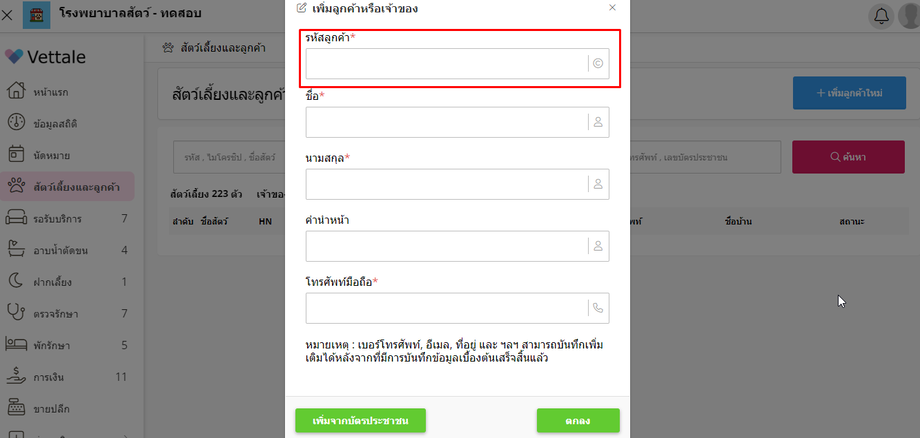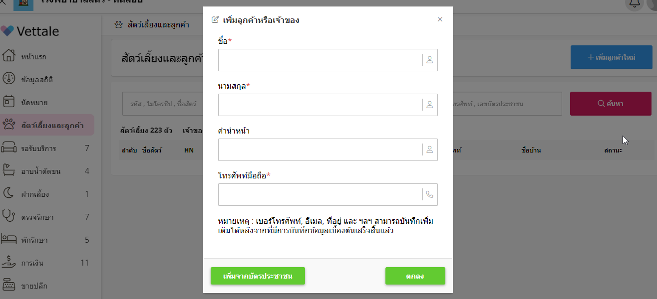 ในระบบการทำงานของโปรแกรม Vettale จะทำกำหนดให้มีการ บันทึกเลขที่ เจ้าของโดยอัตโนมัติ โดยในการเพิ่มลูกค้าใหม่จะแสดง ดังจอ ดังนี้