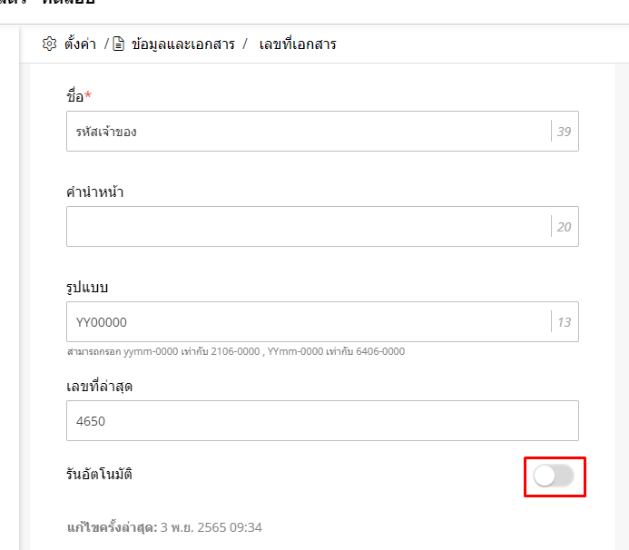 เมนูตั้งค่า > เลขที่เอกสาร > รหัสเจ้าของ > เลือก รันอัตโนมัติ ออก