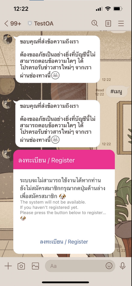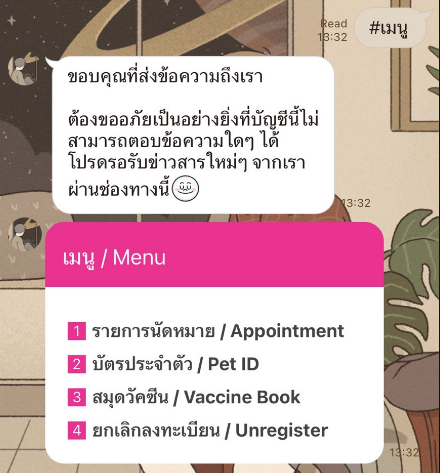 เมื่อคนไข้ทำการ เพิ่มเพื่อนกับระบบ Line OA แล้วให้คนไข้พิมพ์ #เมนู ระบบLine OA จะส่งข้อความอัตโนมัติให้คนไข้ลงทะเบียน
