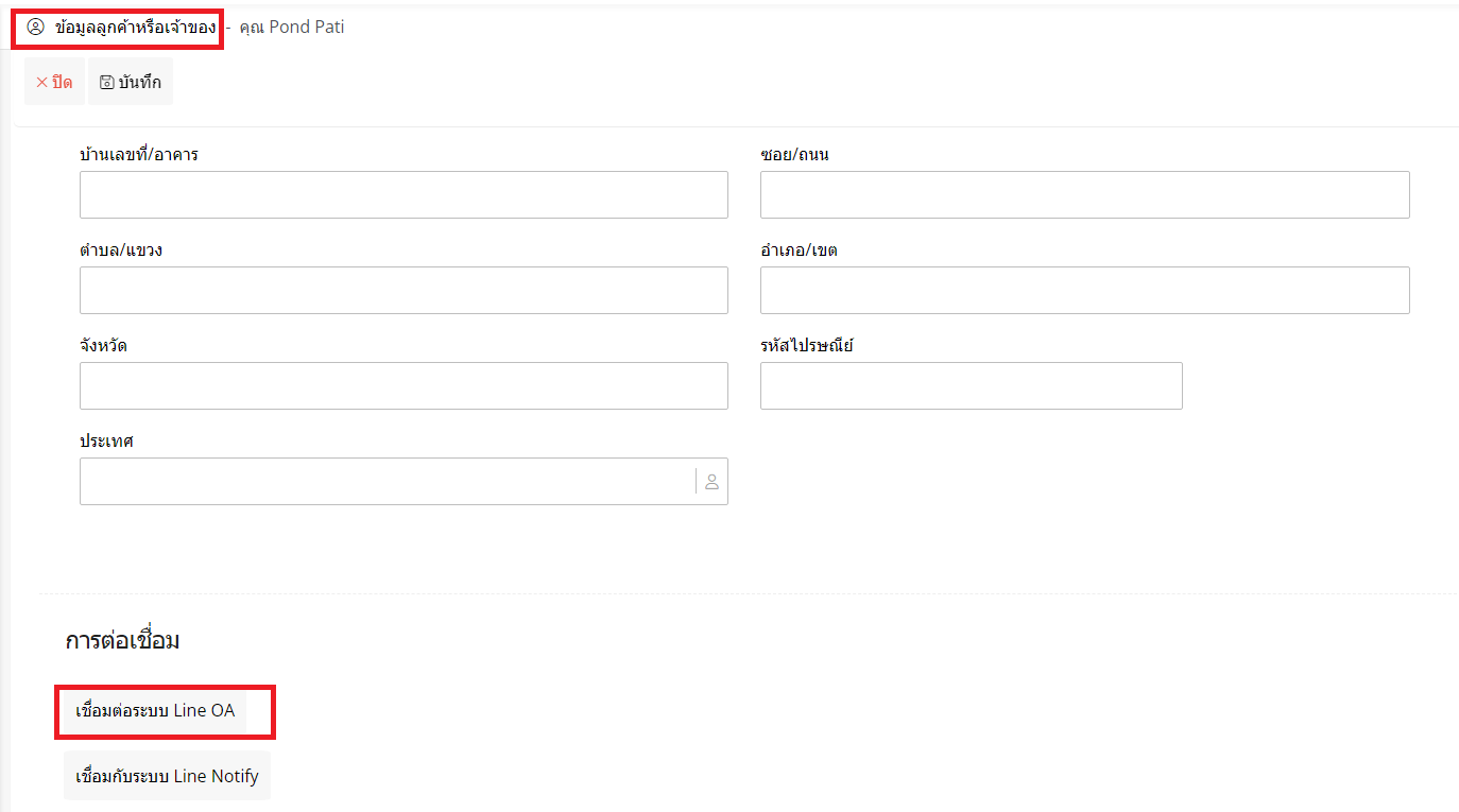 ให้ผู้ใช้งานไปรับรหัสที่ ข้อมูลเจ้าของที่จะทำการสมัคร Line OA และเลื่อนลงมาล่างสุดเลือก เชื่อมต่อระบบ Line OA ระบบจะแสดงรหัส 6 หลักและนำให้ลูกค้า