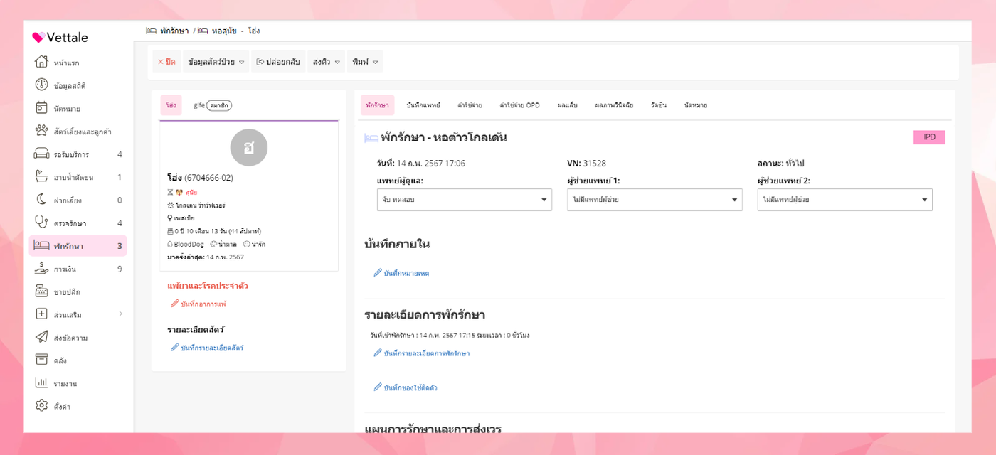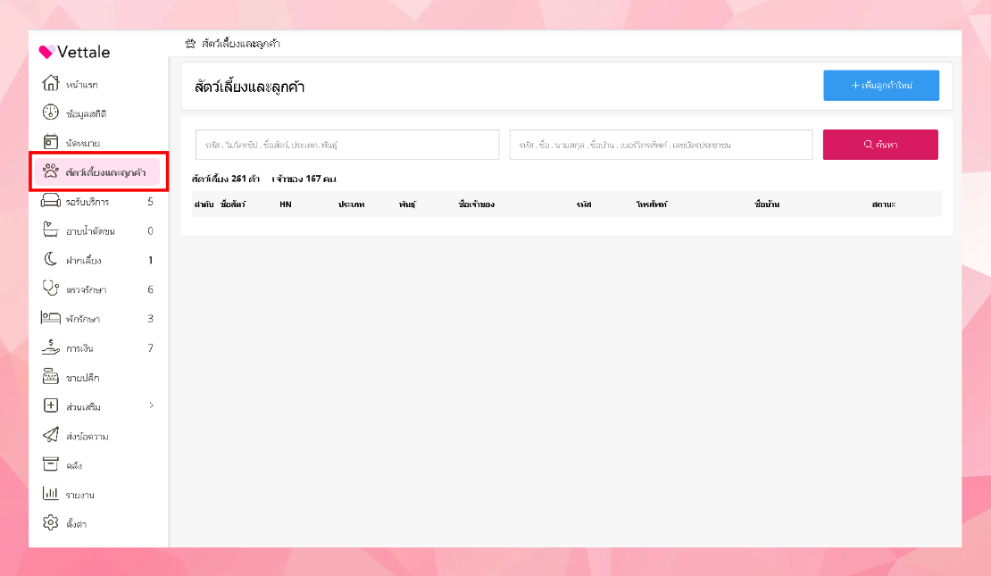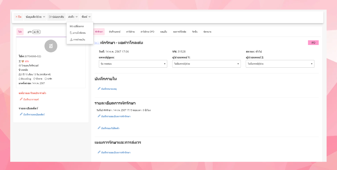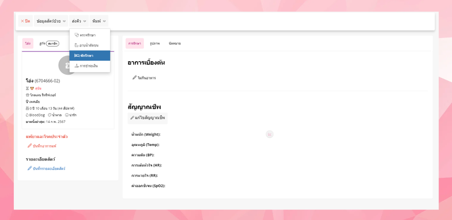 ผู้ใช้งานสามารถส่งเข้าพักรักษาได้โดยการ ไปที่เมนูสัตว์เลี้ยงและลูกค้า