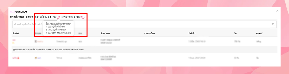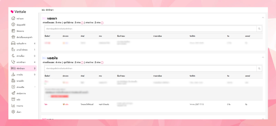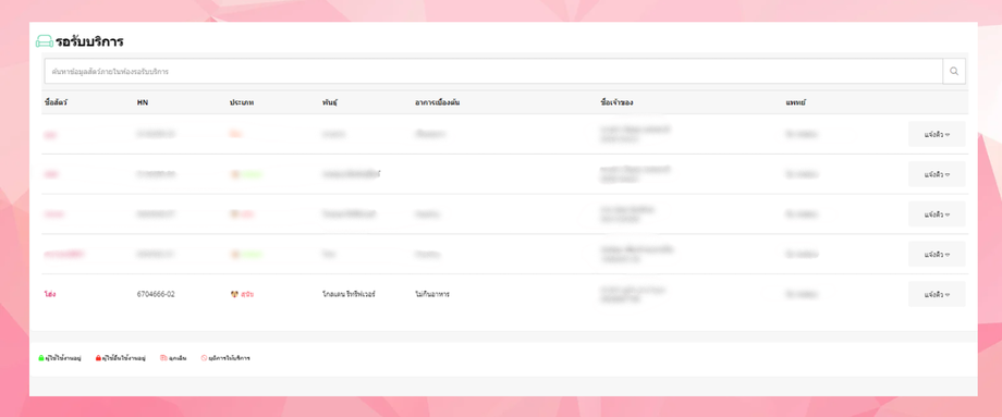 ให้ผู้ใช้งานไปที่เมนู พักรักษา ระบบจะแสดงรายการสัตว์ที่ผู้ใช้งานส่งเข้าพักรักษา โดยจะมีรายละเอียดจำนวนหอพักที่ว่างและถูกใช้งาน