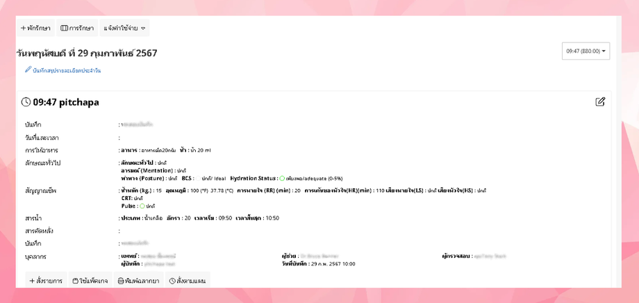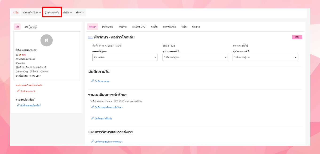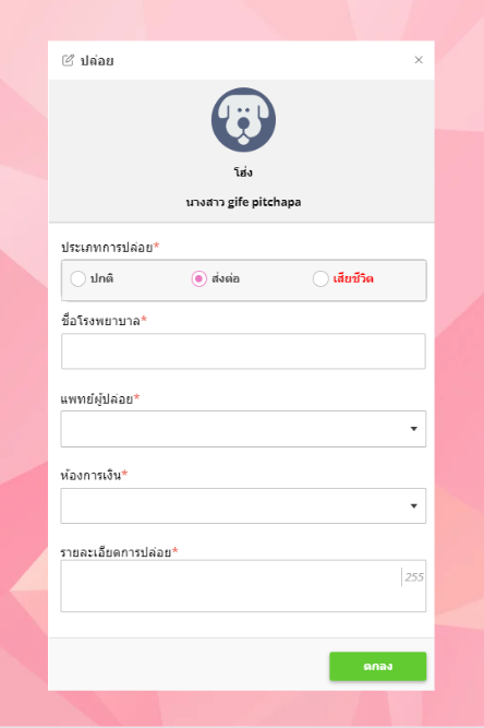 - ผู้ใช้งานเลือกชื่อสัตว์ที่ต้องการส่งพักรักษา