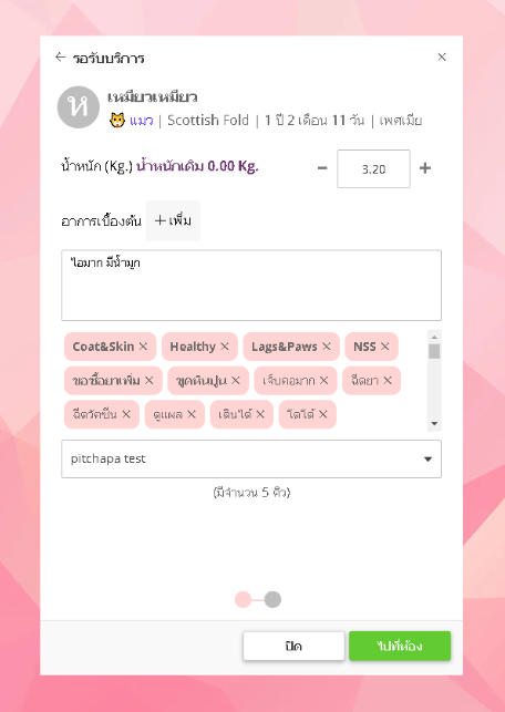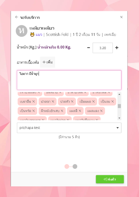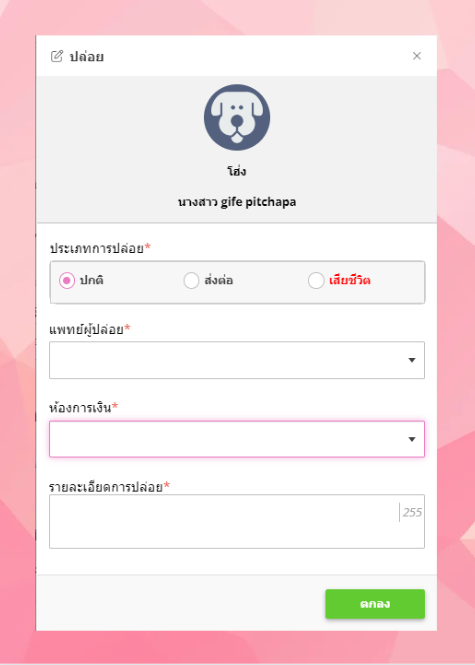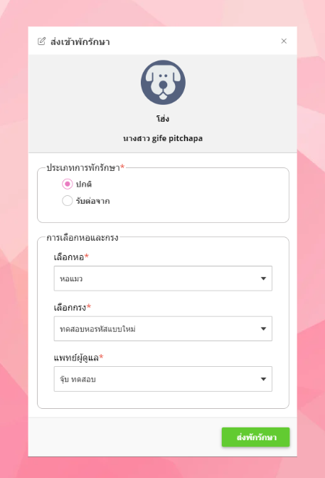 - ให้ผู้ใช้งา่นเลือกสัตว์ที่ต้องการส่งเข้าห้องพักรักษา