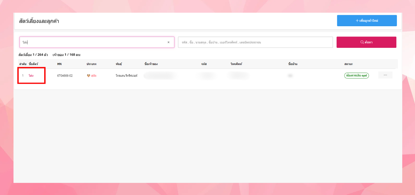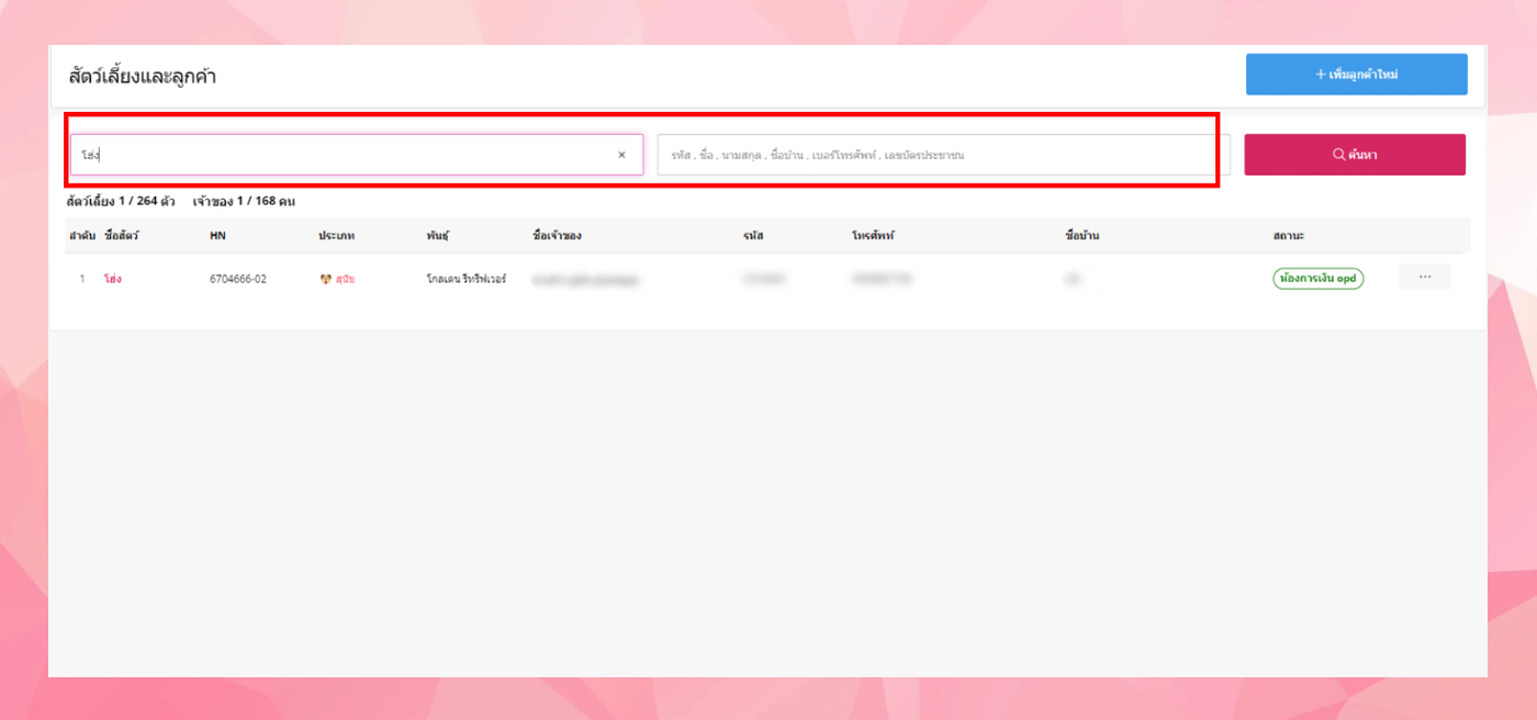 - ผู้ใช้งานกรอกข้อมูลสัตว์ หรือชื่อเจ้าของที่ต้องการได้ที่ช่องค้นหา และคลิกปุ่ม "ค้นหา"