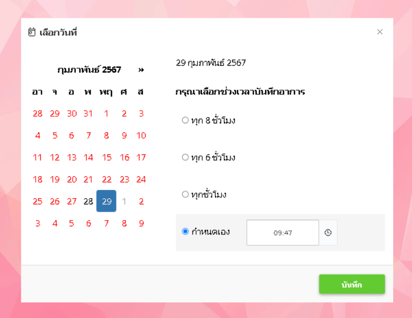 - ระบบจะแสดงหน้าต่างเพื่อให้ผู้ใช้งานเลือกวันที่และเวลาที่ต้องการบันทึก