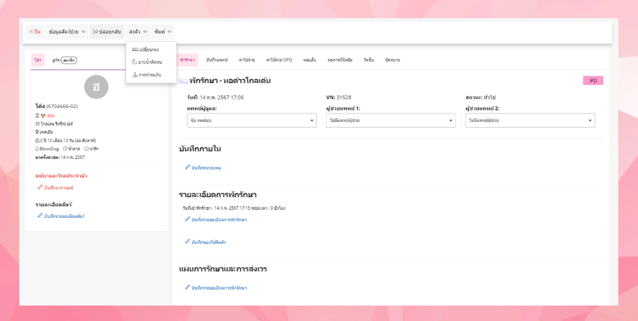 ผู้ใช้งานสามารถบันทึกการพักรักษาและสั่งรายการในแต่ละช่วงเวลาได้โดยการไปที่เมนูพักรักษา