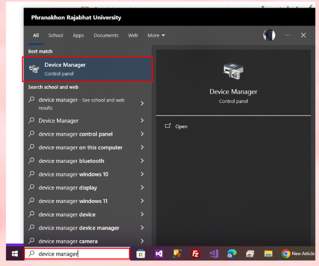 1. พิมพ์ค้นหาตรงช่องค้นหาด้านซ้ายล่างว่า Device Manager