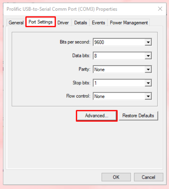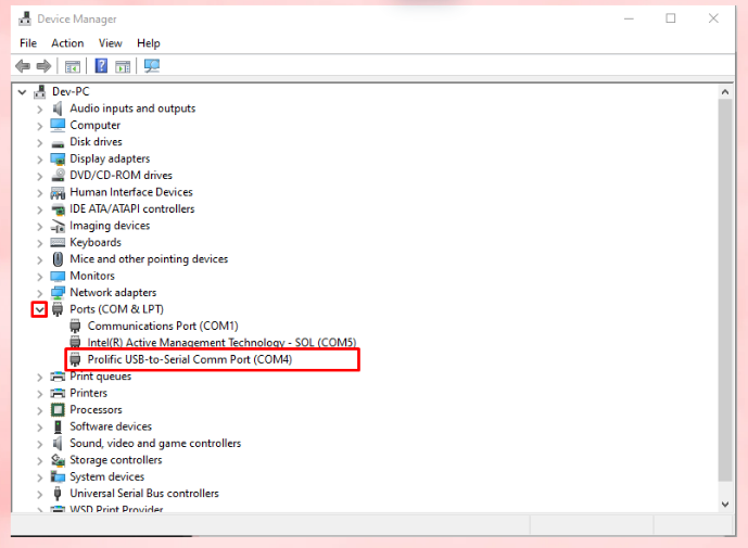 2. กดเลือก Ports คลิ๊กที่ชื่อ Prolific USB-to-Serial Comm Port