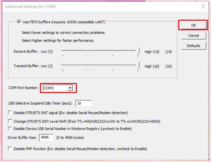 4.จากนั้นเปลื่ยนตรง COM Port Number เป็น COM3 > จากนั้นกด OK แล้วลองใช้งานลิ้นชักครับ