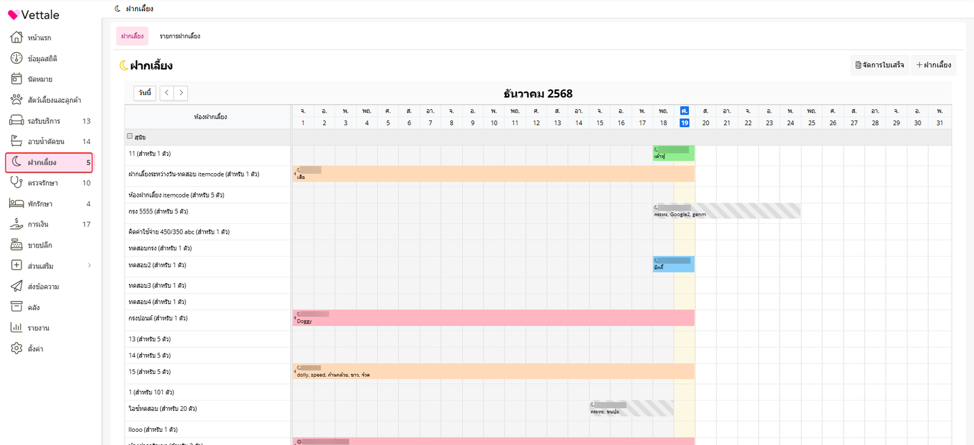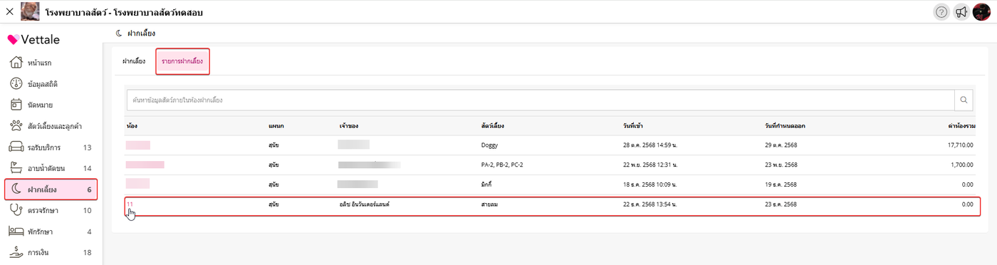 เมื่อผู้ใช้งานอยู่ในหน้าการฝากเลี้ยง ให้ผู้ใช้งานคลิกปุ่ม "+ฝากเลี้ยง" หรือคลิกที่ ห้องฝากเลี้ยงที่ต้องการจอง
