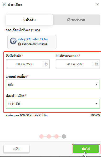 ระบบจะเข้าสู่หน้าต่างเพื่อให้ผู้ใช้งานเลือกประเภทการรับฝากเลี้ยง โดยสามารถเลือกได้ 2 แบบได้แก่ ค้างคืน หรือระหว่างวัน
