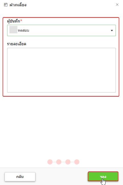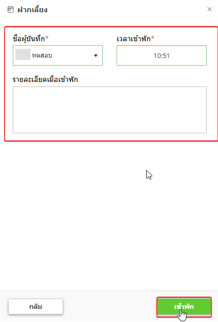 ระบบจะเข้าสู่หน้าต่างรายละเอียด ให้ผู้ใช้งานเลือกชื่อผู้บันทึก และเลือกเวลาเข้าพัก