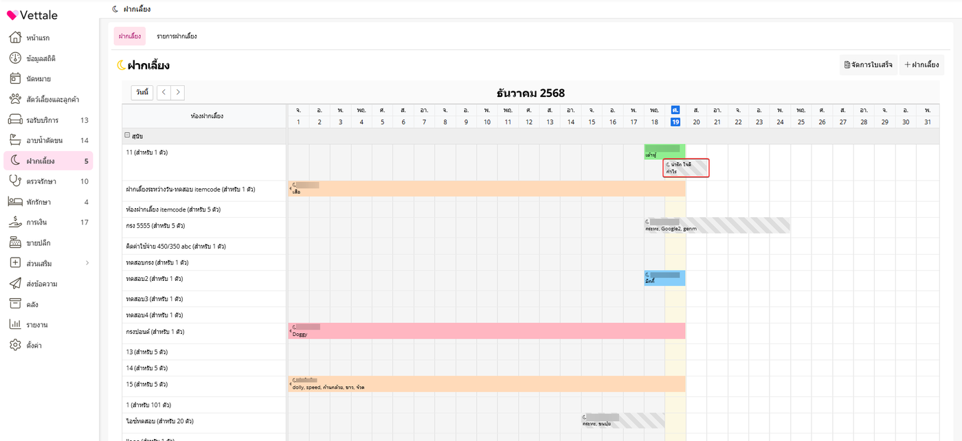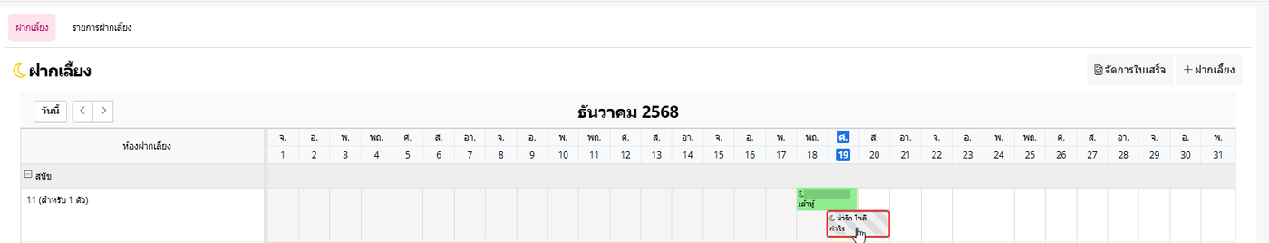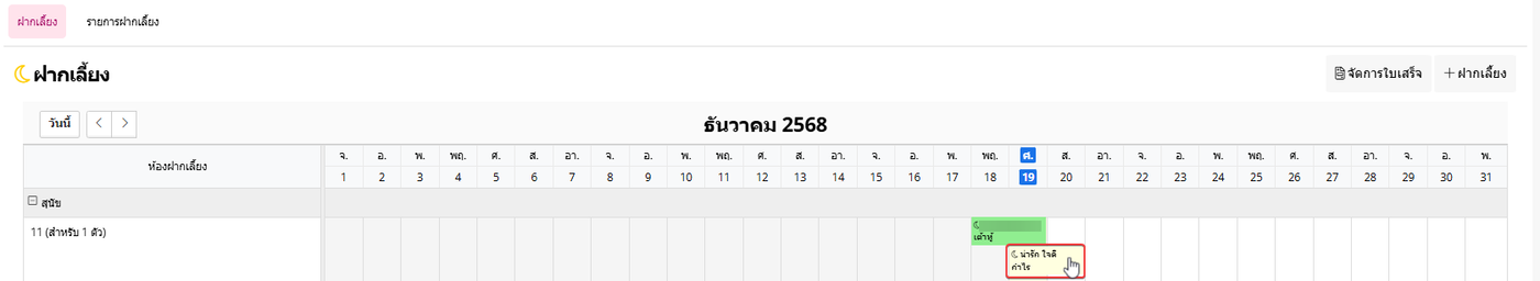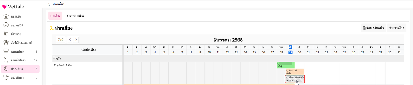 เมื่อผู้ใช้งานจองเสร็จสิ้น รายการฝากเลี้ยงที่ทำการจองจะแสดงอยู่ในปฎิทินของเมนูฝากเลี้ยง