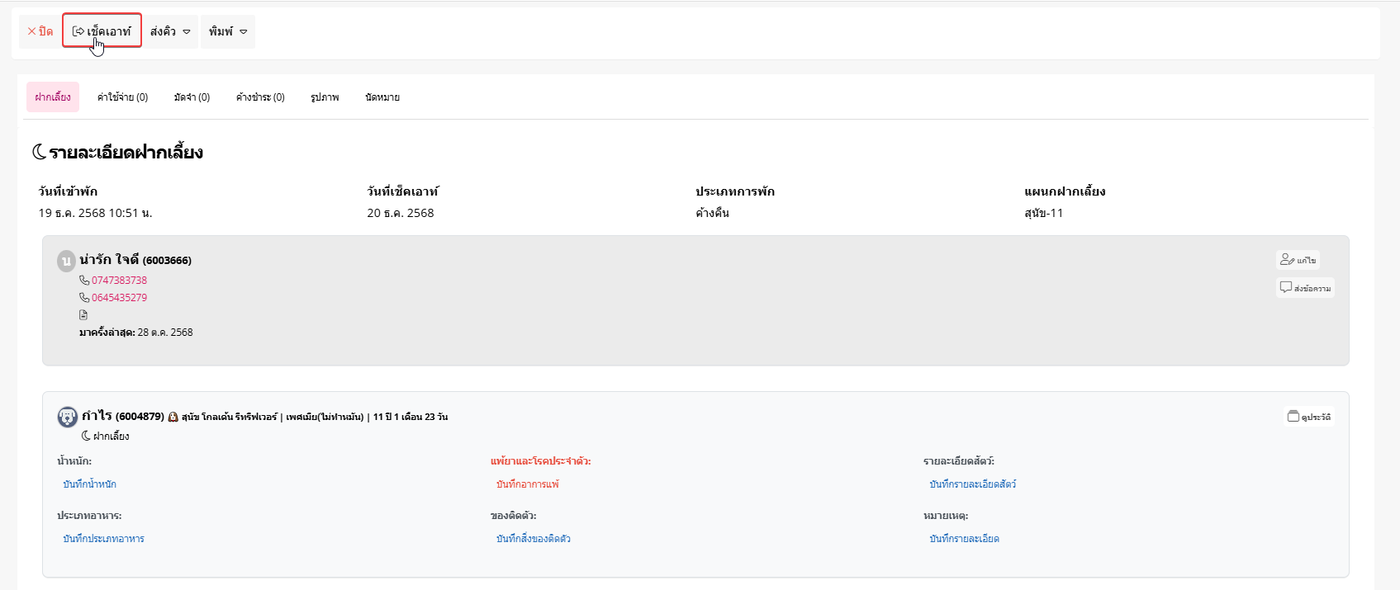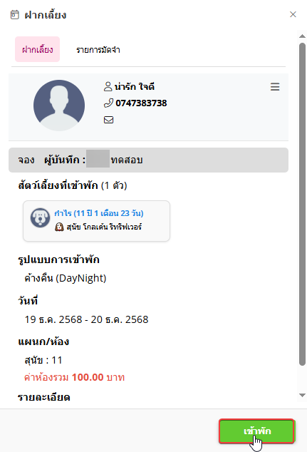 การเข้าพักเสร็จสิ้น ผู้ใช้งานสามารถดูรายการที่กำลังเข้าพักที่เมนูฝากเลี้ยงได้
