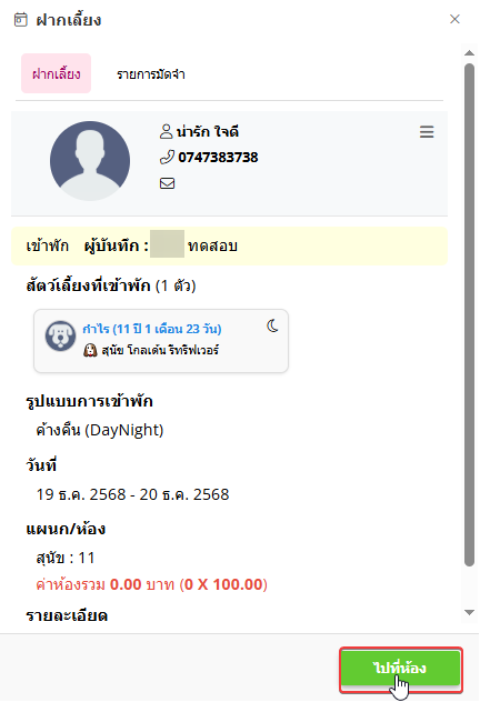ระบบจะแสดงหน้าต่างข้อมูลการรับฝากเลี้ยง ให้ผู้ใช้งานคลิกปุ่ม " ไปที่ห้อง "
