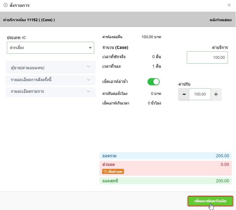 หากมีการเช็คเอาท์ล่าช้า ผู้ใช้งานสามารถเปิดปุ่มการเช็คเอาท์ล่าช้า และกรอกค่าปรับได้