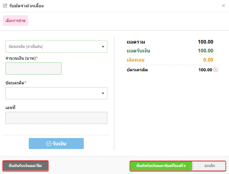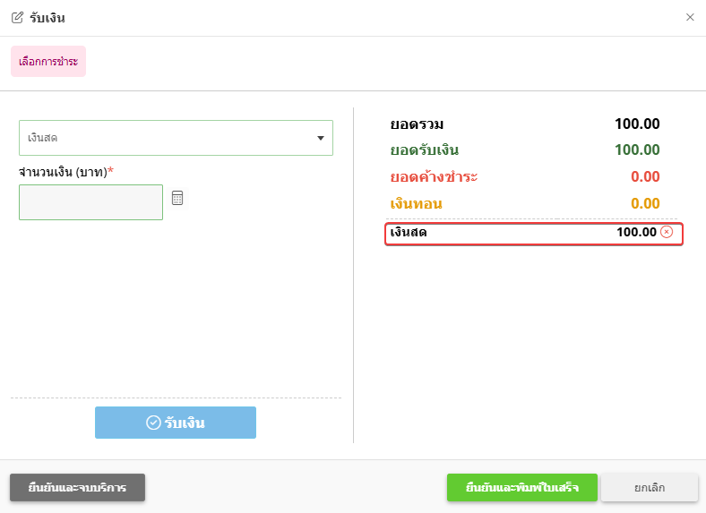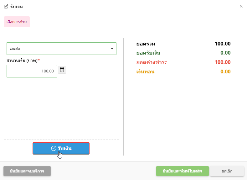 ระบบจะแสดงหน้าต่างการรับเงิน ให้ผู้ใช้งานเลือกวิธีการชำระ และกดรับเงิน
