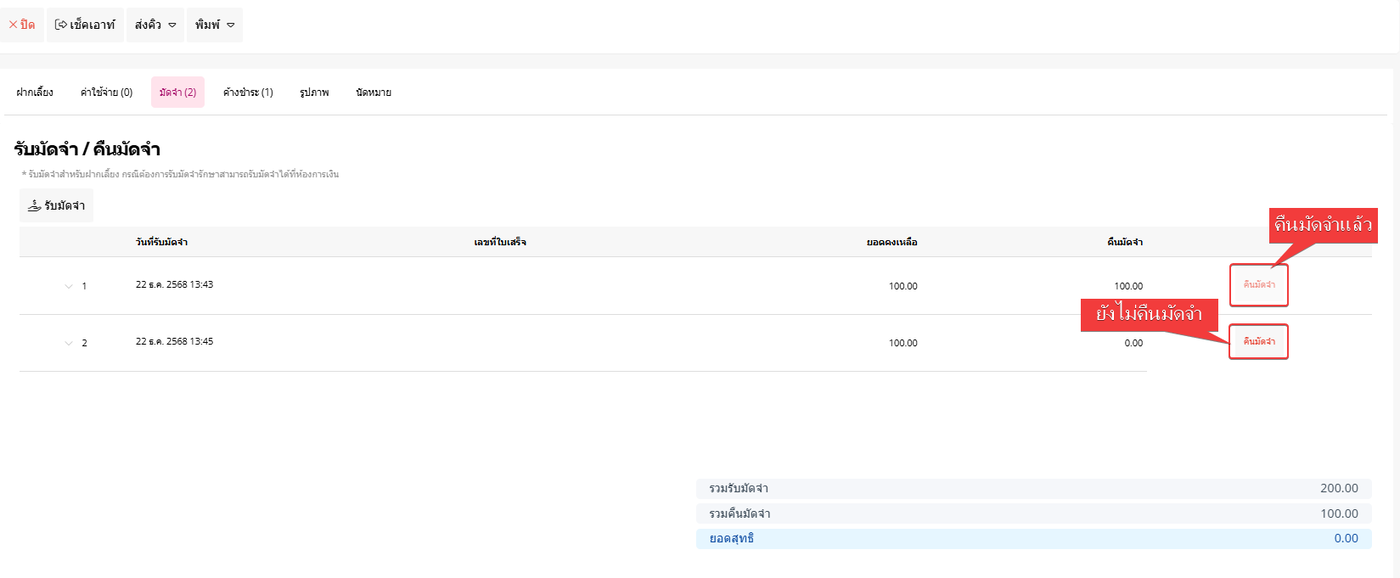 ผู้ใช้งานมาที่แถบมัดจำ ซึ่งจะมีรายการที่สามารถคืนมัดจำได้