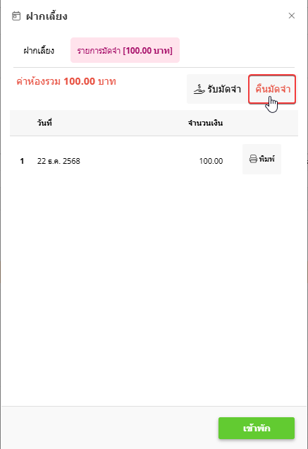 เมื่อผู้ใช้งานรับเงินมัดจำเสร็จเรียบร้อย ผู้ใช้งานสามารถคืนมัดจำได้ก่อนจะคลิก เข้าพัก