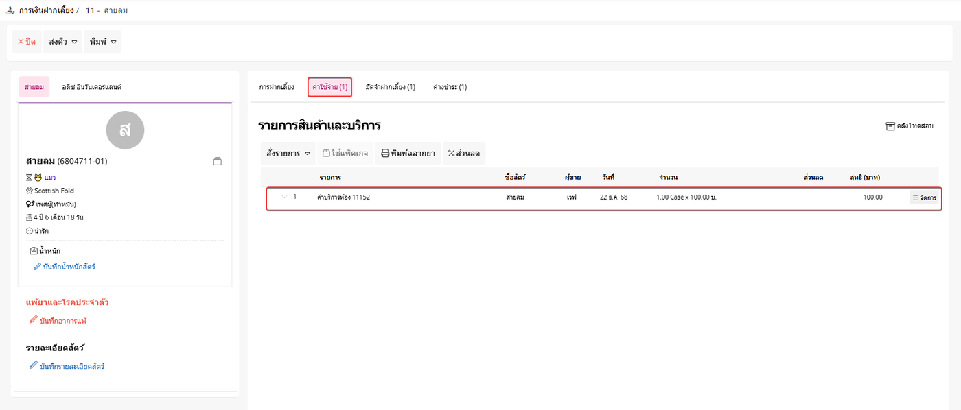 ผู้ใช้งานเลือกรายการฝากเลี้ยงที่ต้องการเก็บค่าบริการ