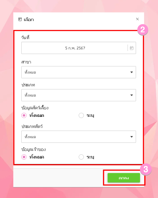 - เลือกวันที่ สาขา, ประเภทแพ็คเกจ (คอร์สครั้งหรือคอร์สปริมาณ), ข้อมูลสัตว์เลี้ยง ประเภทสัตว์ และข้อมูลเจ้าของ