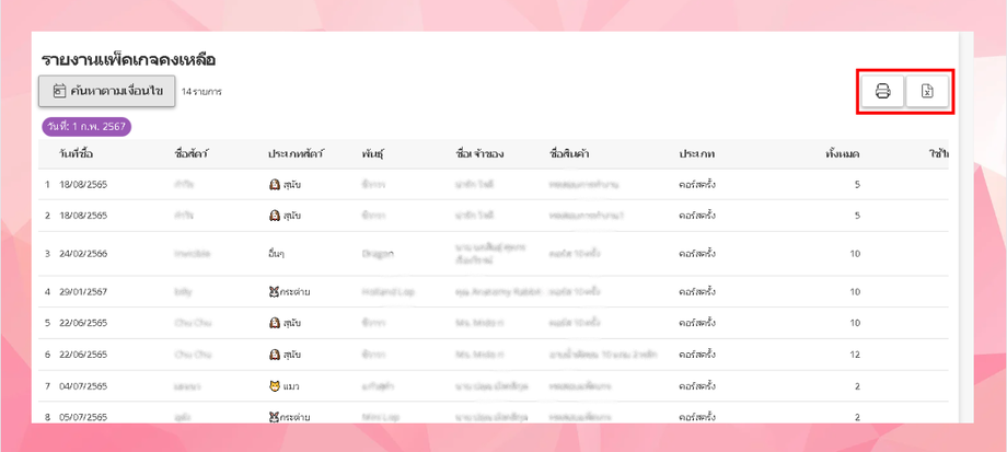 เมื่อผู้ใช้งานทำการคลิกตกลง ระบบจะแสดงข้อมูลที่ผู้ใช้งานทำการค้นหา (สามารถสั่งพิมพ์ และ เปิดใน excel ได้)