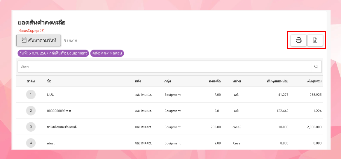 รายงานข้อมูลคลังที่เกี่ยวกับสินค้าคงเหลือจะมีการให้ค้นหาข้อมูลเกี่ยวกับยอดคงเหลือของสินค้าต่าง ๆ ที่ถูกเก็บรักษาในคลังสินค้าของคลินิก รายงานนี้สามารถให้ข้อมูลที่มีประโยชน์ในการวิเคราะห์และบริหารจัดการสินค้า