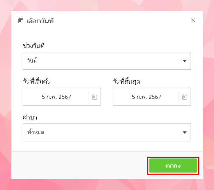ช่วงวันที่ ผู้ใช้งานเลือกช่วงวันที่ หรือ กำหนดวันที่เอง : ระบบจะทำการค้นหาในช่วงวันที่ที่ผู้ใช้งานระบุ