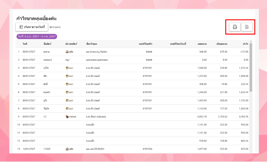 เมื่อผู้ใช้งานทำการคลิกตกลง ระบบจะแสดงข้อมูลที่ผู้ใช้งานทำการค้นหา (สามารถสั่งพิมพ์ และ เปิดใน excel ได้)