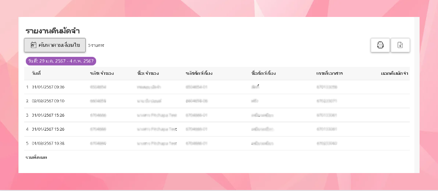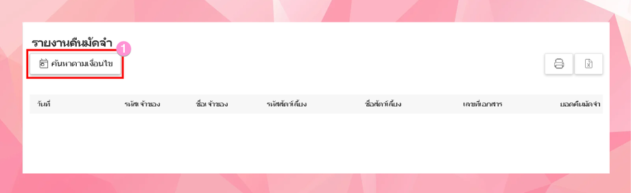 การค้นหานี้ช่วยให้คุณดึงข้อมูลที่ต้องการออกมาเพื่อวิเคราะห์หรือรายงานข้อมูลการคืนมัดจำของลูกค้าได้ตามที่คุณต้องการ ทั้งนี้ ข้อมูลที่ได้จะแสดงรายละเอียดการคืนมัดจำตามเกณฑ์ที่คุณได้กำหนด