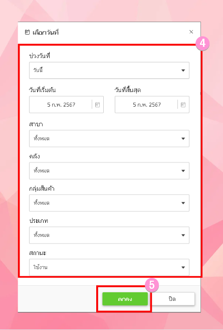 - การเลือกวันที่, คลัง, กลุ่มสินค้า, ประเภท, สถานะ ในรายงานคลังสินค้าเป็นขั้นตอนที่สำคัญเพื่อดึงข้อมูลที่ต้องการจากวันที่ที่กำหนด