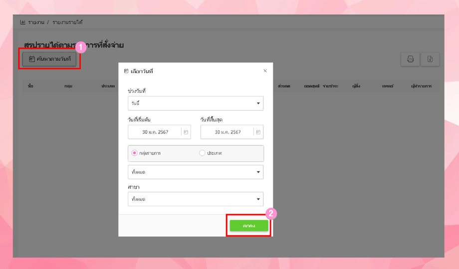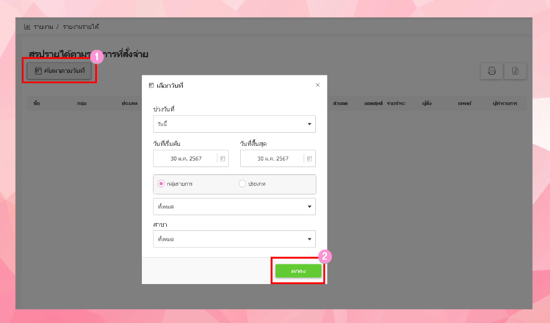 ไปที่เมนูรายงาน > คลิก สรุปรายได้ตามรายการที่สั่งจ่าย