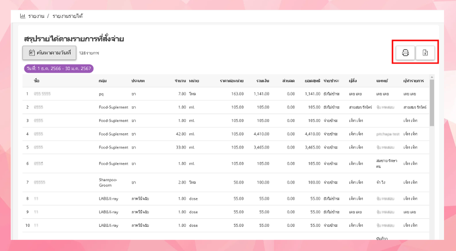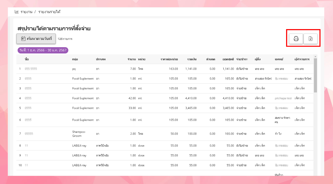 ระบบจะแสดงข้อมูลสรุปรายได้ตามรายการที่สั่งจ่าย (สามารถสั่งพิมพ์และเปิดในexcelได้)