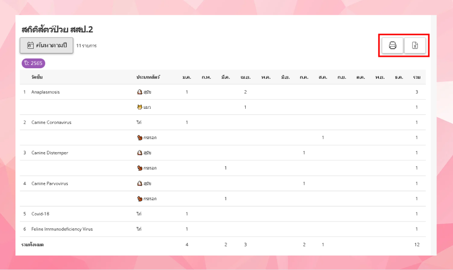 รายงานเกี่ยวกับการป้องกันโรคสัตว์ป่วยที่มาใช้บริการภายในปี โดยแยกตามประเภทสัตว์
