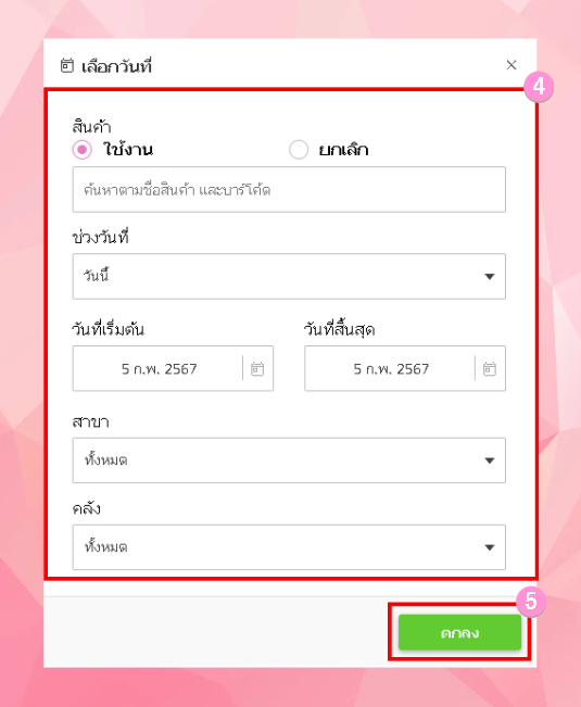 ผู้ใช้งานสามารถทำการค้นหาสินค้าที่ยังใช้งานอยู่ หรือ ยกเลิก ได้จากคลังที่ผู้ใช้งานเลือก และในช่วงวันที่, คลัง ที่คุณกำหนด หลังจากที่ผู้ใช้งานให้ข้อมูลนี้ ระบบหรือโปรแกรมที่คุณใช้งานจะทำการค้นหาและแสดงผลลัพธ์ตามเงื่อนไขที่ผู้ใช้งานกำหนด