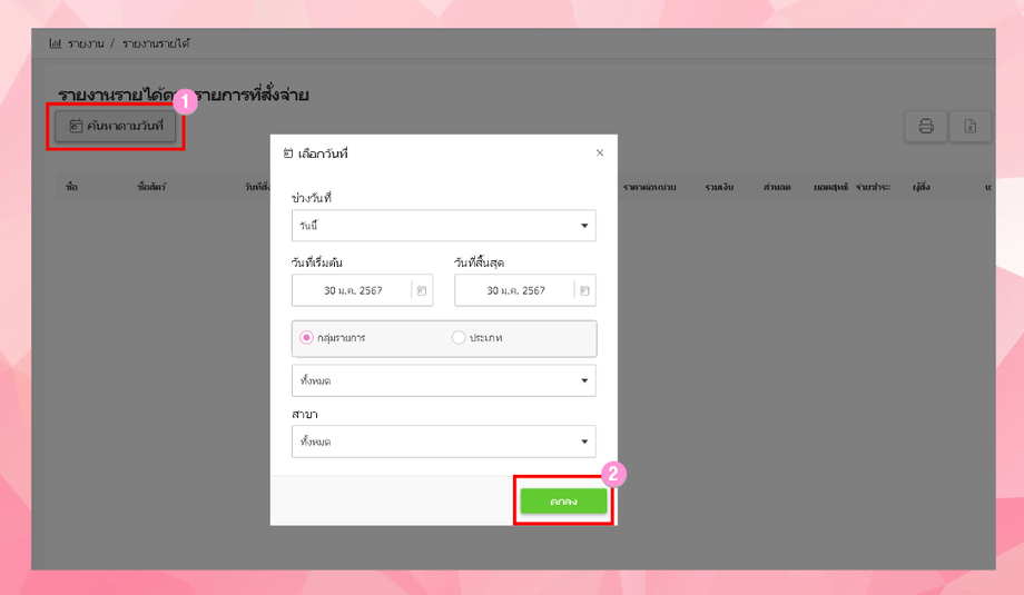 ไปที่เมนูรายงาน > คลิก รายละเอียดรายได้ตามรายการที่สั่งจ่าย
