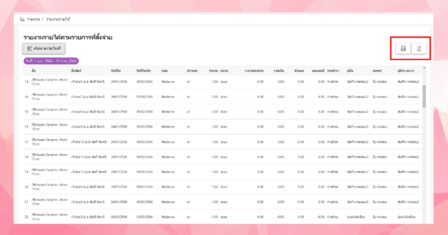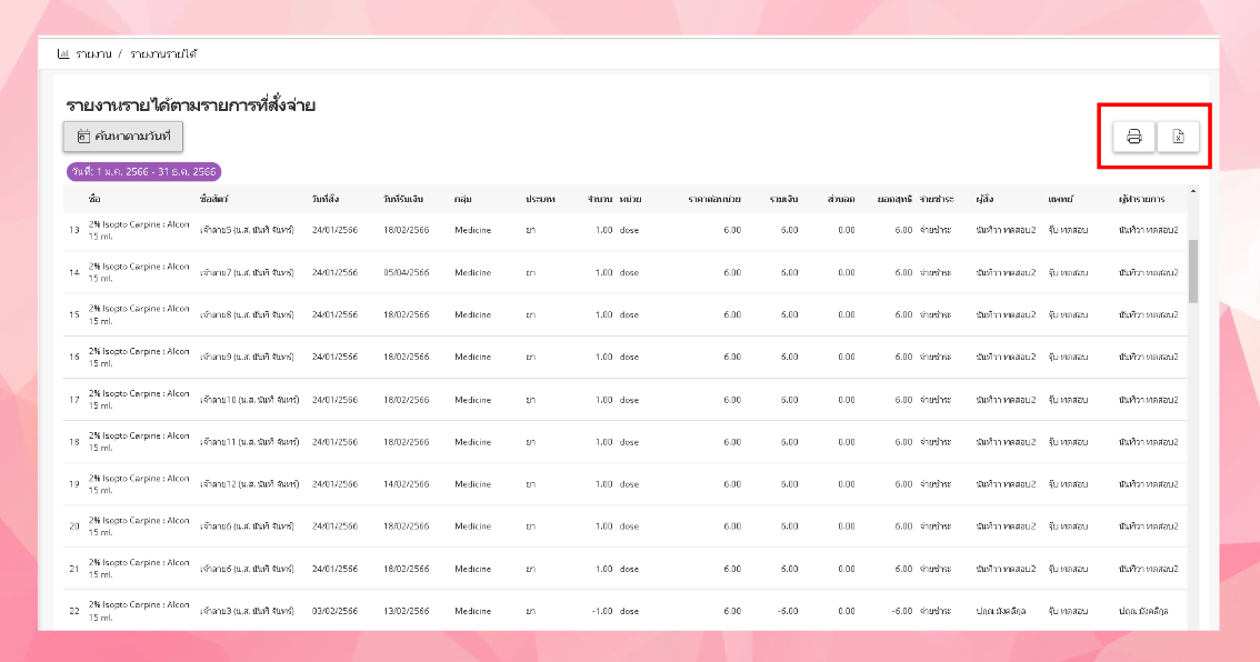 ระบบจะแสดงข้อมูลสรุปรายละเอียดรายได้ตามรายการที่สั่งจ่าย(สามารถสั่งพิมพ์และเปิดในexcelได้)