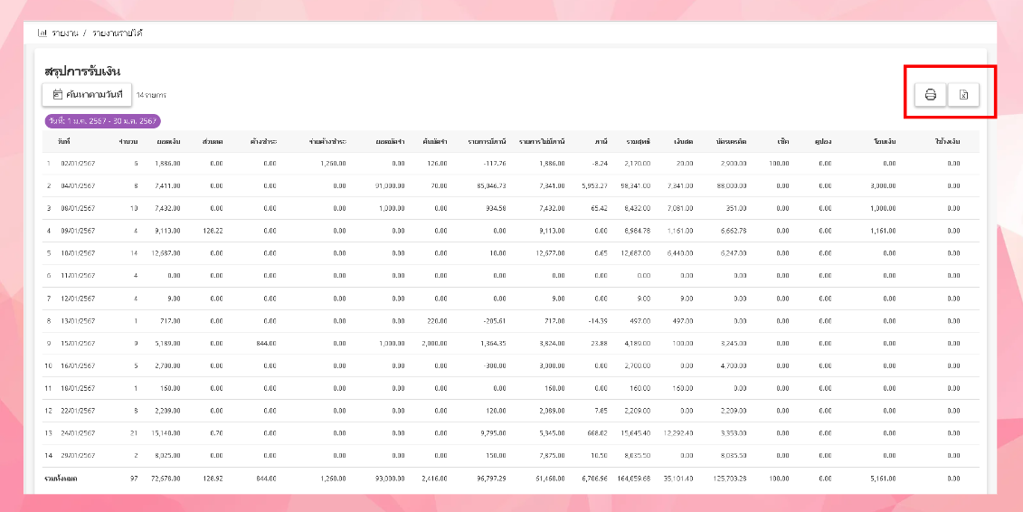 รายงาน สรุปการรับเงินการรับเงินแยกตามวัน เป็นเอกสารที่สร้างขึ้นเพื่อนำเสนอข้อมูลที่สรุปรวมเกี่ยวกับยอดการรับเงินของคลินิกหรือโรงพยาบาล
