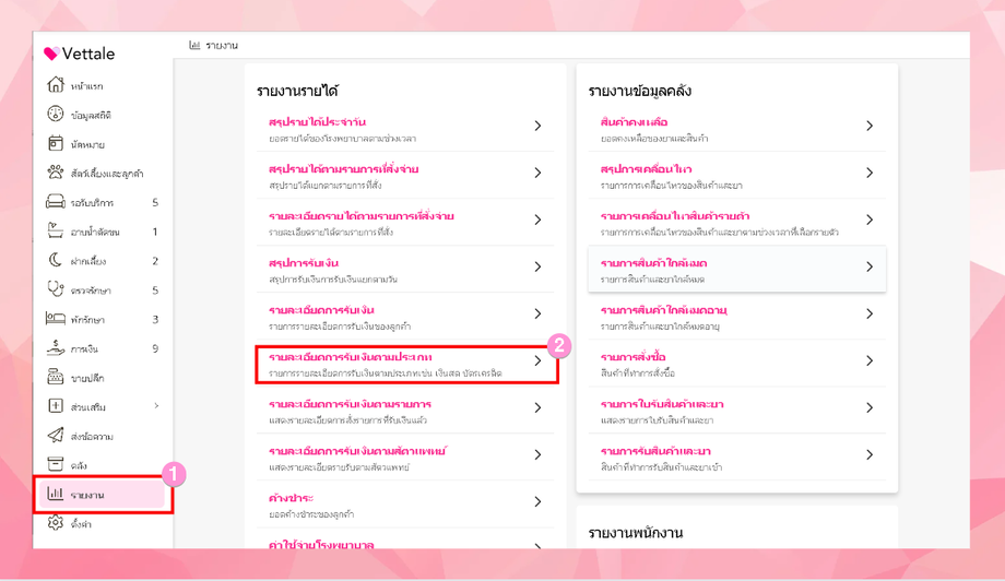 การทำงานของระบบนี้จะช่วยให้ผู้ใช้สามารถดูแลและติดตามการรับเงินของลูกค้าตามประเภทการชำระต่าง ๆ ได้โดยรวดเร็ว ซึ่งทำให้ง่ายต่อการวิเคราะห์ข้อมูลการเงินและบริหารจัดการการเงินของคลินิก