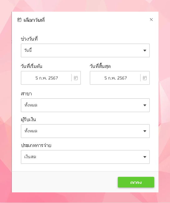 - ประเภทการจ่าย ระบุประเภทการจ่ายที่ผู้ใช้งานต้องการ เช่น เงินสด บัตรเครดิต