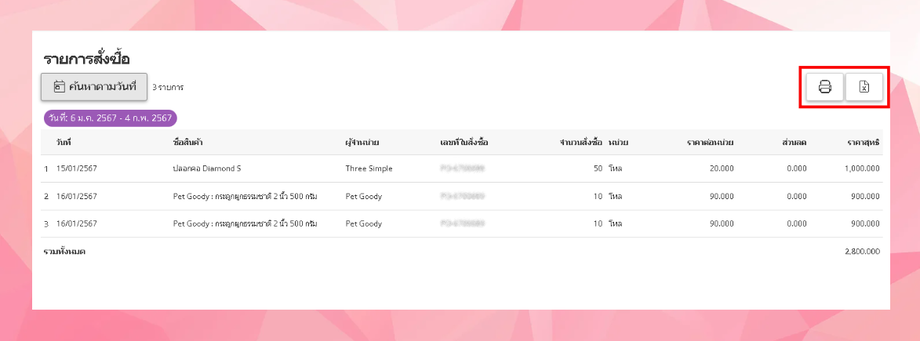 - ผู้ใช้งานสามารถเลือกทำการค้นหารายการสั่งซื้อจาก ผู้จำหน่าย หรือ สินค้า ได้ หลังจากที่ผู้ใช้งานให้ข้อมูลนี้ ระบบจะทำการค้นหาและแสดงผลลัพธ์ตามเงื่อนไขที่ผู้ใช้งานกำหนด